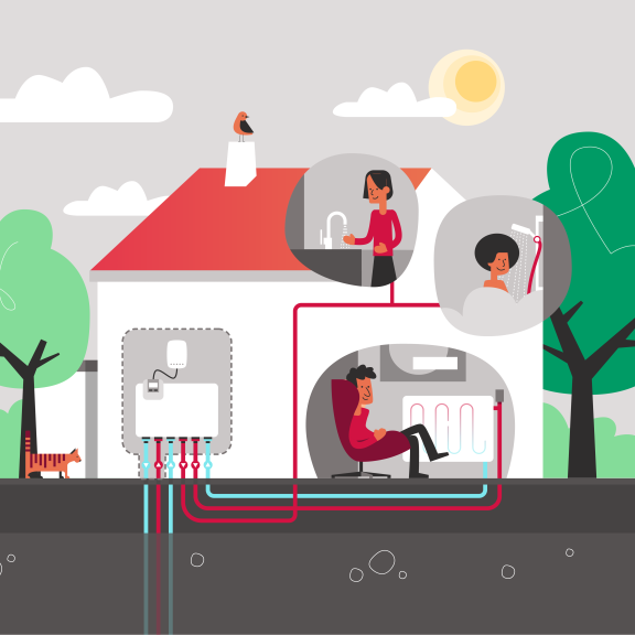 - Het opgewarmde water stroomt naar je douche en kranen.